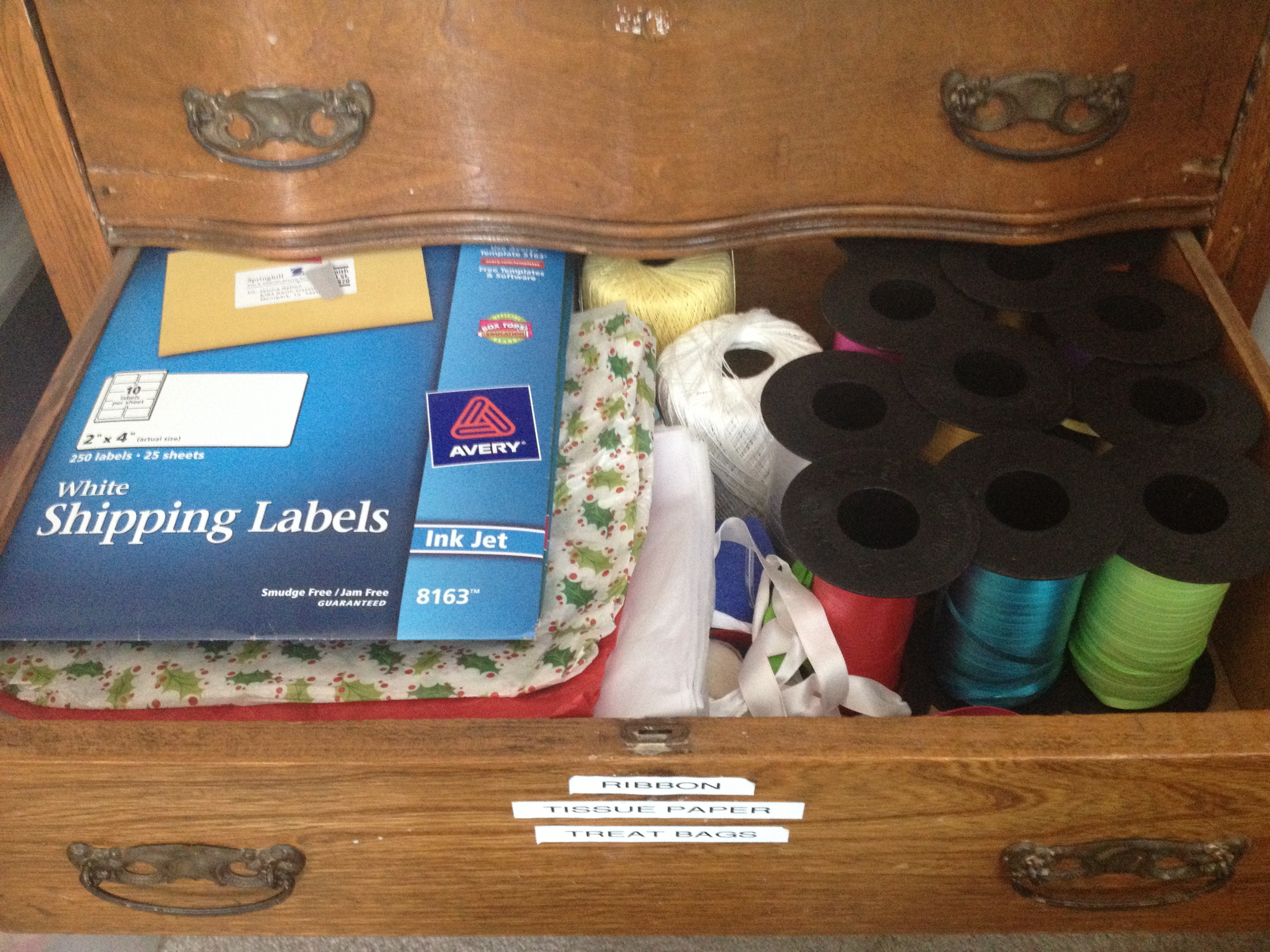 Purchase tubs or find containers to store decorations, ornaments, presents and gifting extras. I chose clear tubs for decorations because I like to see what is inside; but I repurposed opaque tubs for presents, antique drawers for gifting extras and an old recycle bin for wrapping paper to make the most of what I already owned.  Store like items together and consider labeling tubs and drawers for easy reference.  Wrap fragile items in tissue paper, towels or newspapers to protect them.