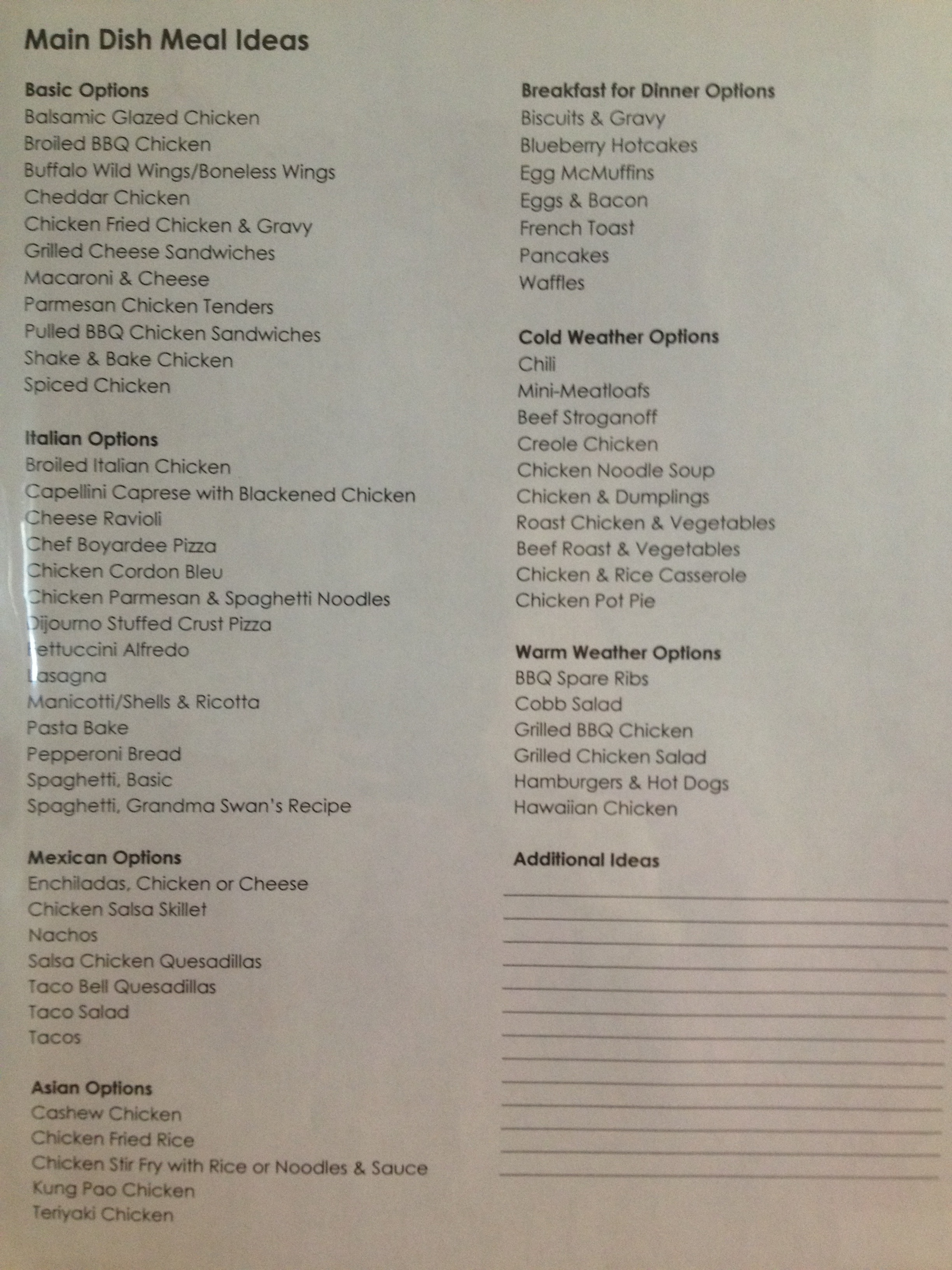 When we were first married, my husband Matt and I made a comprehensive list of the main dishes that we liked to eat on a regular basis.  The list has grown over the years as we’ve tried new recipes and discovered new favorites; the value of this list has increased exponentially.  We’re able to vary our meals by rotating options on the list each week.  I’d suggest making a list like this for yourself and posting it inside a kitchen cabinet for easy reference.  Our list is a simple Word document that is divided into categories and alphabetized.  Related recipes are stored in my recipe SparkBook.