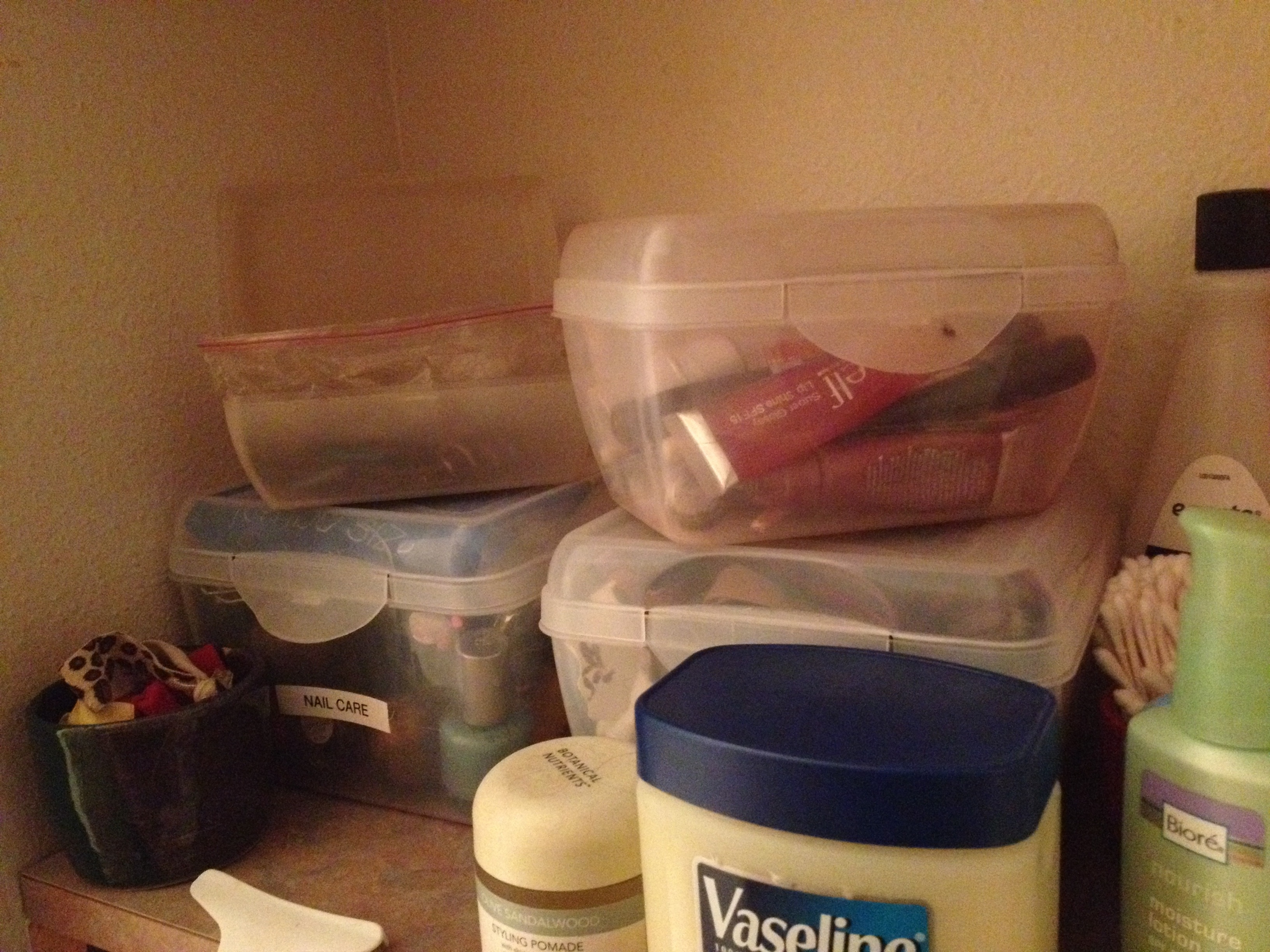 These make it easy to use the needed items, and then stack & store when not in use.  You can close the container and travel with it easily. I keep my makeup, nail polish, and hair accessories in closeable containers in our master bathroom. You’ll also see a re-purposed pottery bowl that I use for my fancy rubber bands–It’s like a fun game to see how you can make items you already own work for what you need now and it’s a great way to eliminate excess.