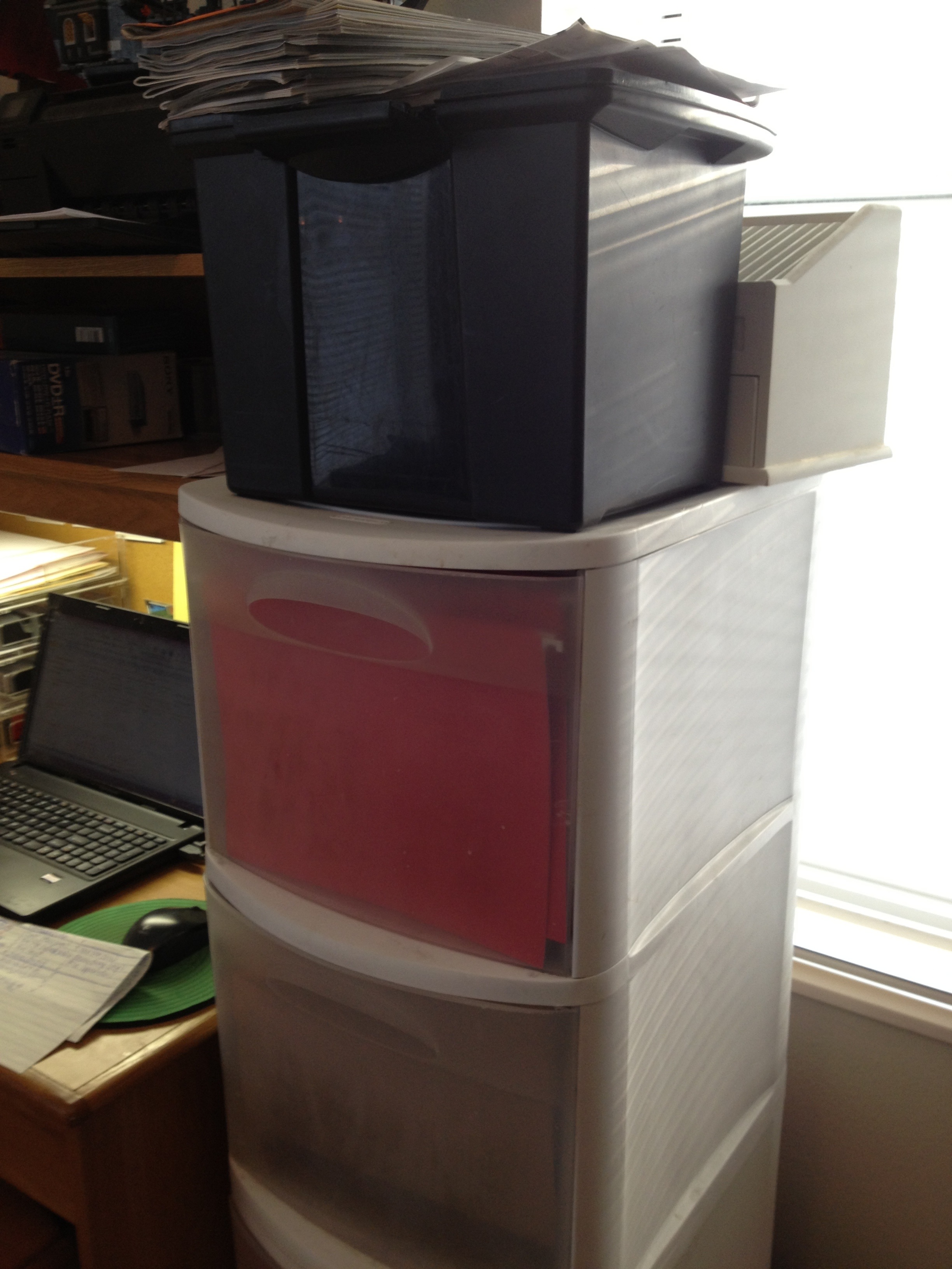 Keep your files together where you need them and use the same organization system for all of your documents, forms and records.  We have 5 filing storage areas in our office right next to our desk with the computer and financial information.  We purchased these plastic file bins when we were first married (it was what we could afford at the time) and have used them ever since, because even though we could purchase something better–the cheap version still serves it’s purpose.  Continuing to use an item through its life cycle is another great way to eliminate excess–remember, just because you can purchase something new, doesn’t mean it’s needed.