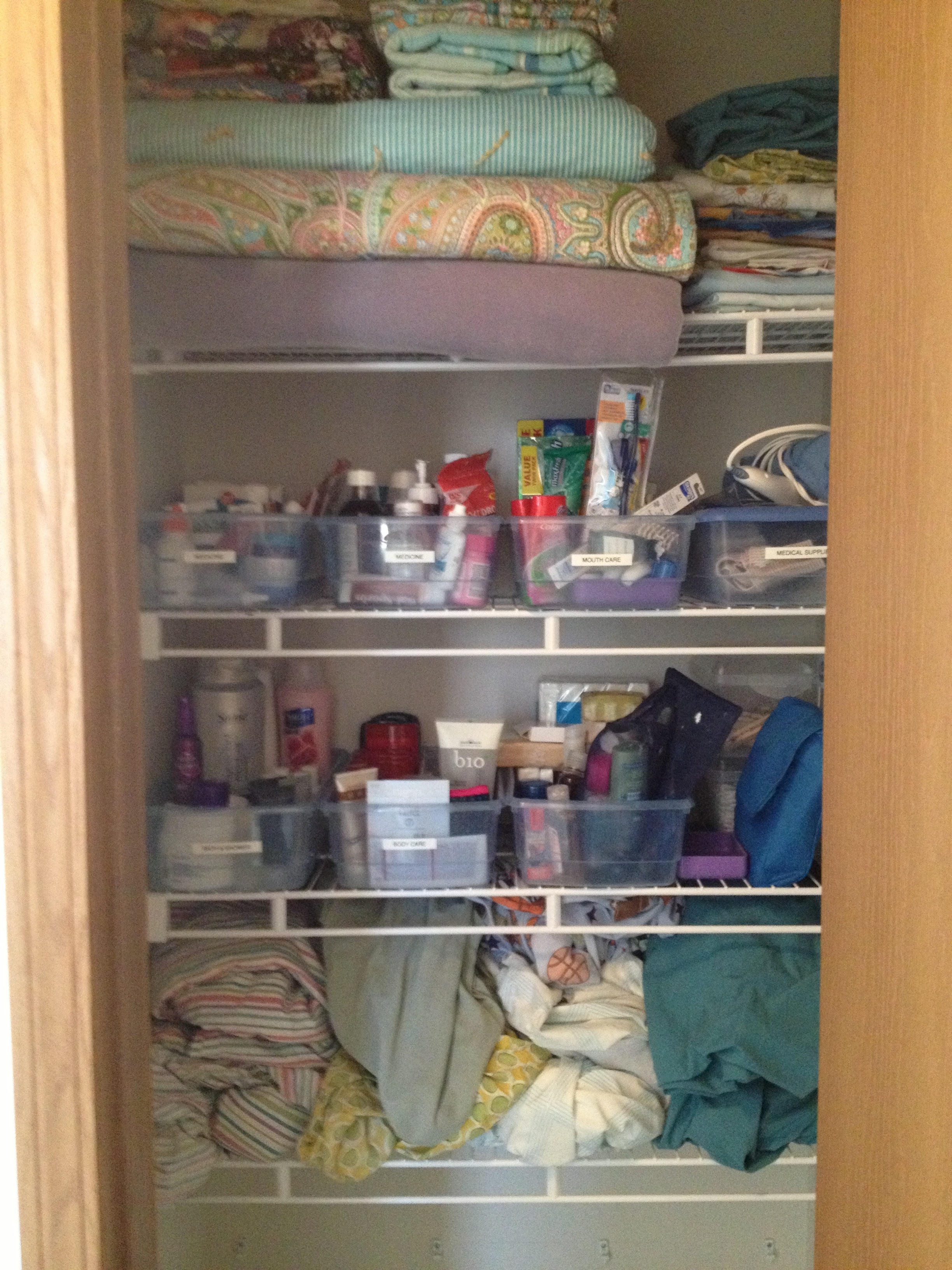 Your storage needs to work for you in every area.  For closets, consider making the most of each shelf.  Keep safe items on shelves reachable by kids (because they may get pulled down often for playing).  Keep rarely used items out of reach on the top shelf.  And use containers to corral all small items into categories–remove the lids to allow yourself to grab needed items with just one hand.  We have our closet storage organized into these containers: bath & shower, body care, bandages & medicine, medical supplies, mouth care, soap & hand gel, and travel toiletries.