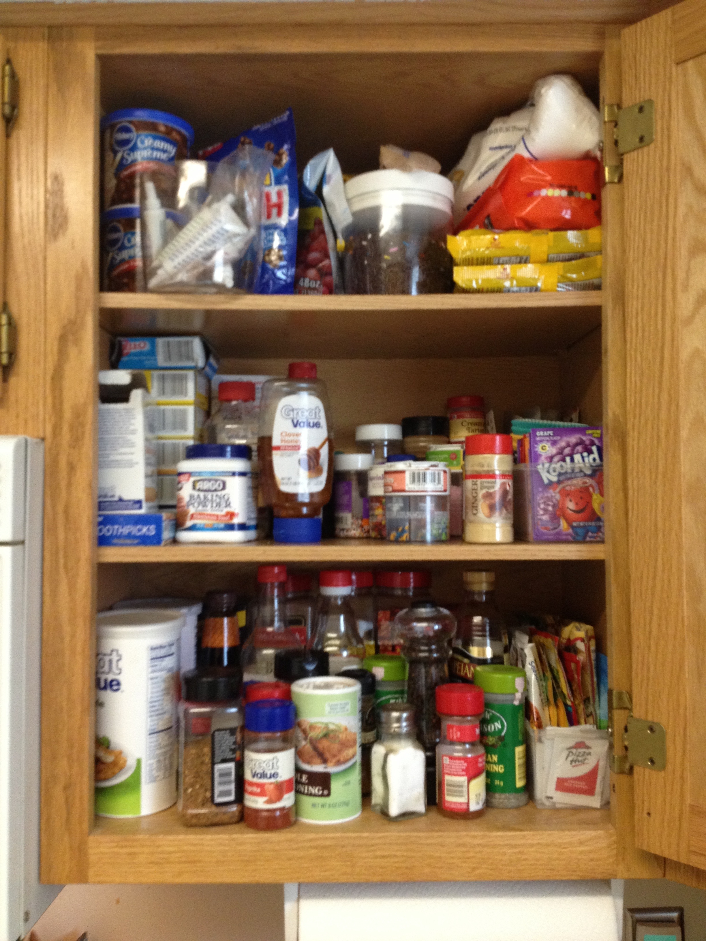 - The middle shelf is baking supplies: sweet spices, drink mixes, jello packets, sprinkles and honey