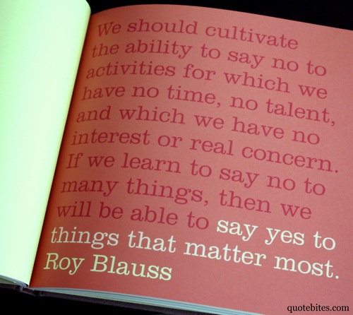 “We should cultivate the ability to say no to activities for which we have no time, no talent, and which we have no interest or real concern. If we learn to say no to many things, then we will be able to say yes to the things that matter most. ” –Roy Blauss