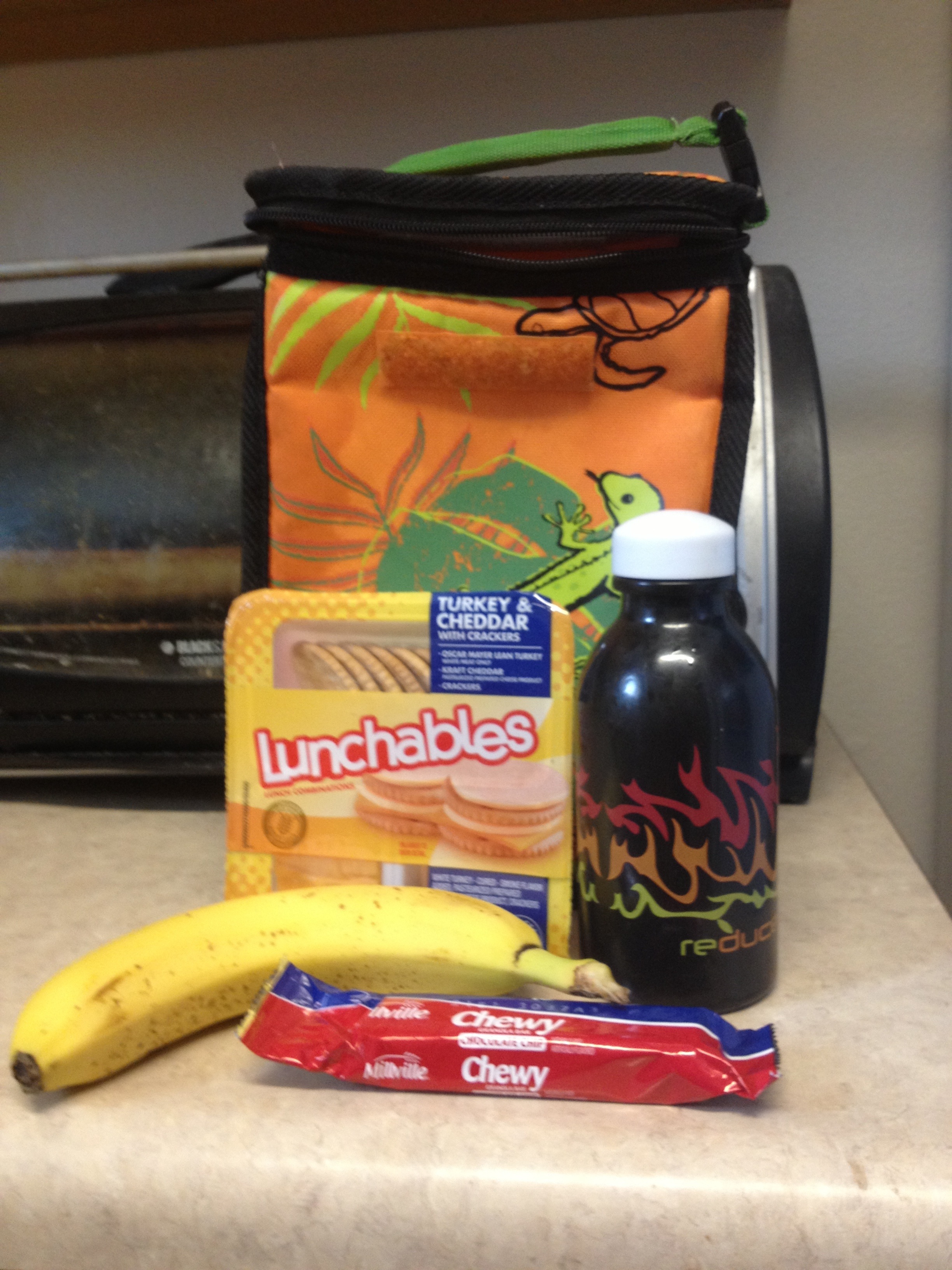 For me, I pack 1-2 cups of frozen vegetables (peas or broccoli) and main dish for lunch (like pre-cooked spaghetti or black beans and cheese in a tortilla–I don’t buy pre-made meals because I can do it myself much cheaper and easier when I prep on the weekends), 3 pieces of fruit for snacks (keep healthy snacks visible so you choose them first!), cheese for a snack.  I keep crackers, peanut butter and granola bars at work already, so I can add these to snacks as needed. Consider setting up 5-7 healthy, delicious lunch options for yourself so you can rotate choices and stock healthy, lasting snacks where you need them so you can eat them through the day, even if you forget to pack them at home.