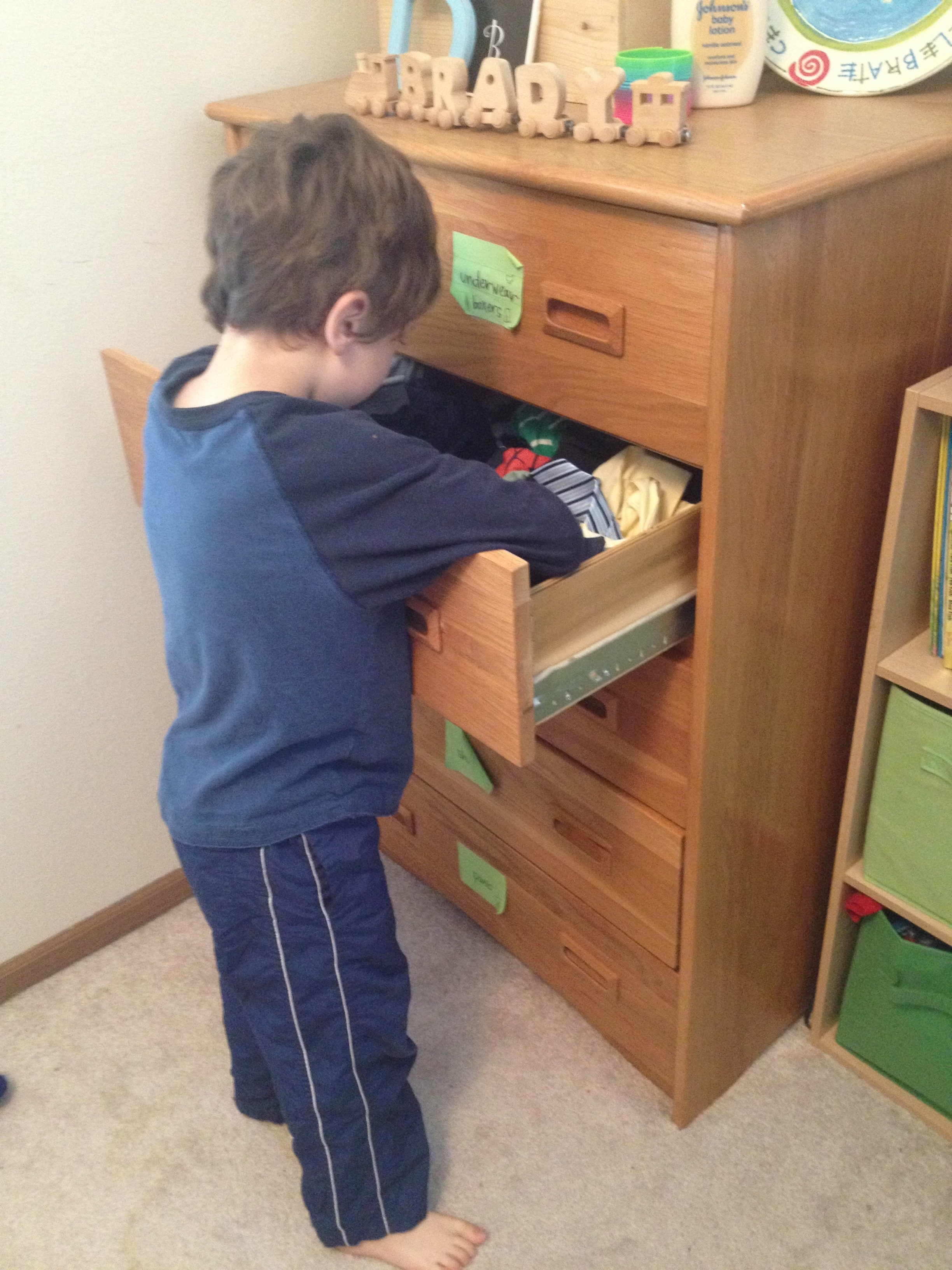 Our kids are both boys and have standard, comfortable clothing choices.  Long or Short sleeved shirts, pants or shorts and shoes or sandals.  In the mornings, the kids can grab these options and get dressed quickly–no major decisions needed.  Many days, they’ll dress themselves–and if they look a little wild, great! If necessary, set out clothing options for kids to help speed them up in the mornings–or if they’re old enough, have them pick out clothes the night before so they just have to get dressed in the morning, with no decisions.