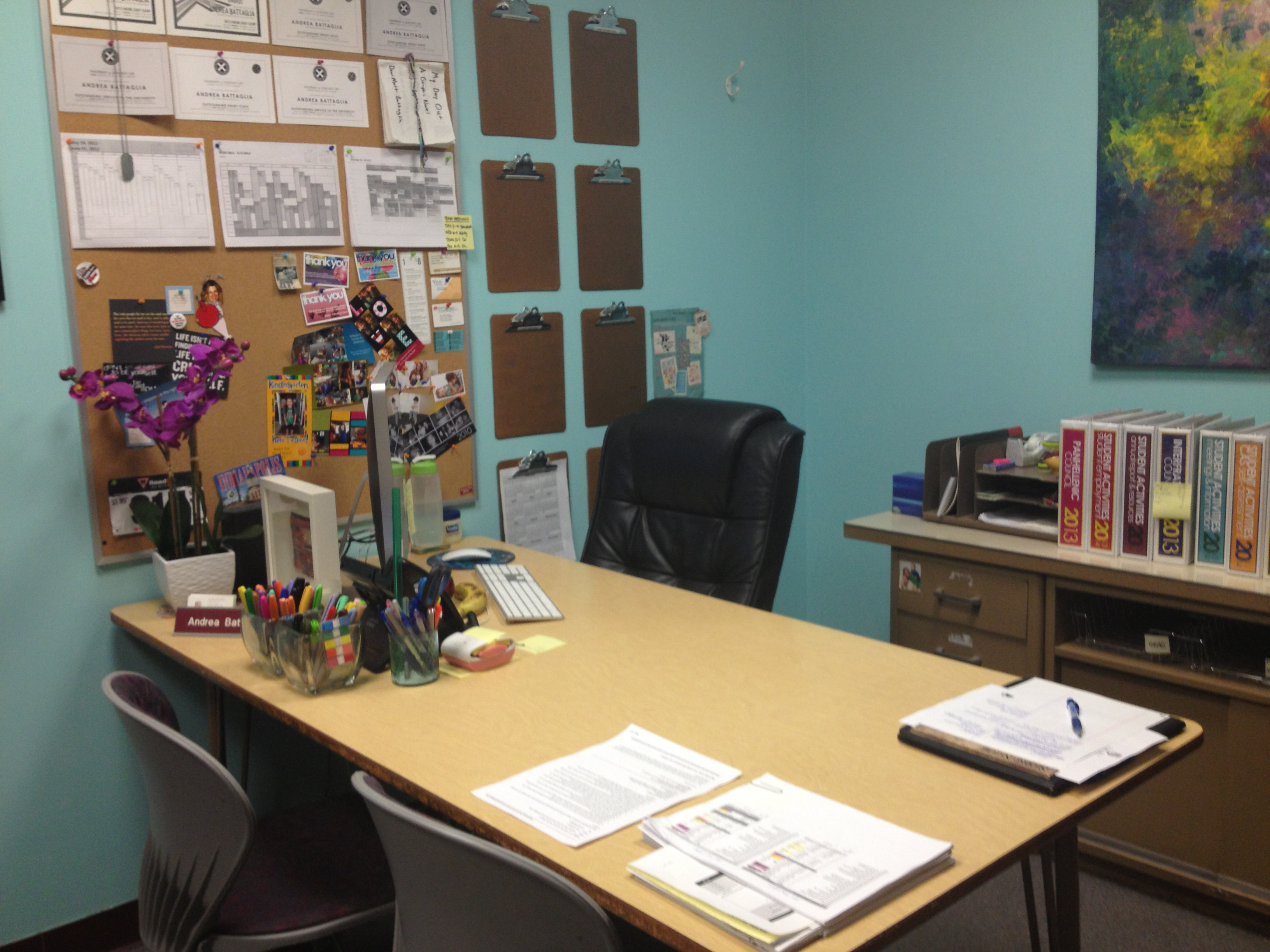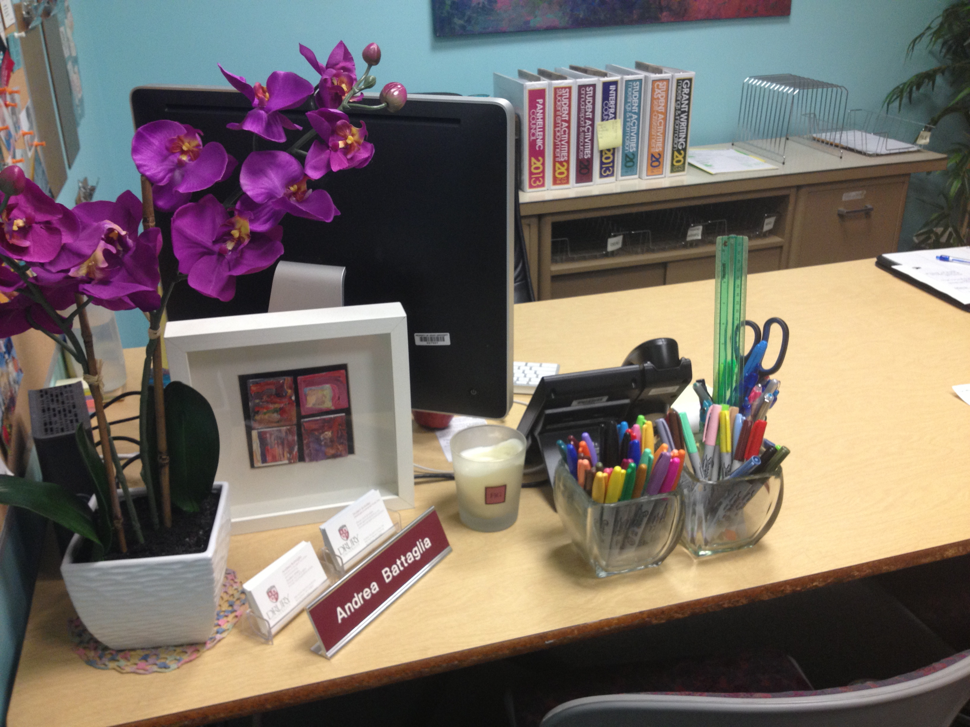 Make it a place you like to be. I painted the walls “Spa Blue” frosted the windows for a spa feel and keep tons of fun resources at my desk–like sharpies and post-it notes. I also have tons of plants and flowers (all fake, alas, no green thumb here) so I have nice things to look at regularly. When you bring in your favorite things to your office/desk area, then you enjoy your time here more. And when you spend so much time at work, you should make it a place that you really enjoy!