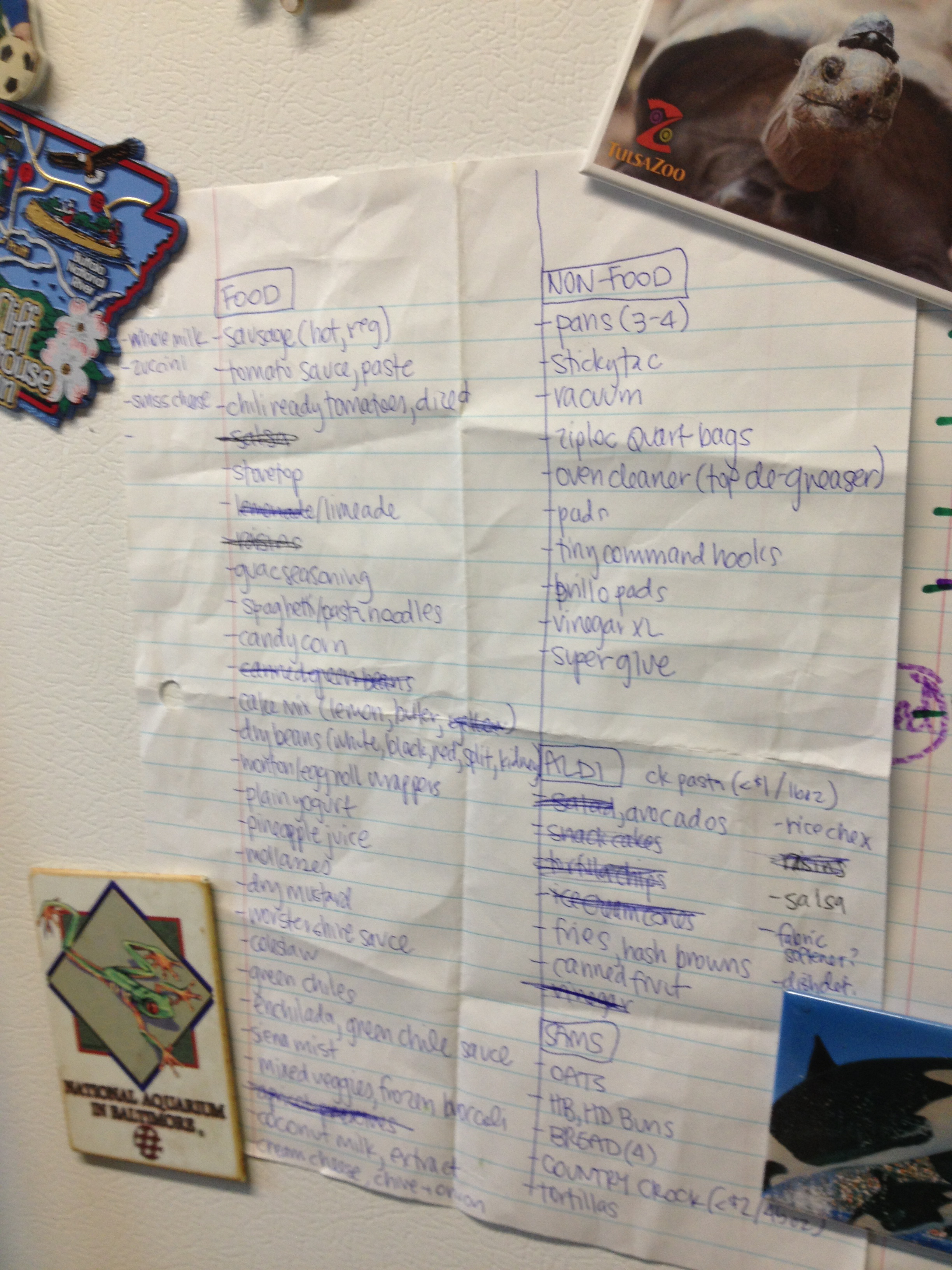Keep a Grocery List. Post your grocery list in a very visible location, like the front of the fridge, so you (and the family) can add to it as items are depleted.  When you’re shopping–stick to the list.  And if the item isn’t on sale, you’ll need to determine if you really need it.  If it isn’t necessary, save it for a future shopping trip (I limit myself to 3-4 non-sale items per trip max).  Make special notes for items with coupons, items to price match or items that are on sale, so you remember to use these items.  And don’t go shopping when you’re hungry.  Price matching and sale shopping take time, and it’s hard to think when you’re starving and surrounded by food.