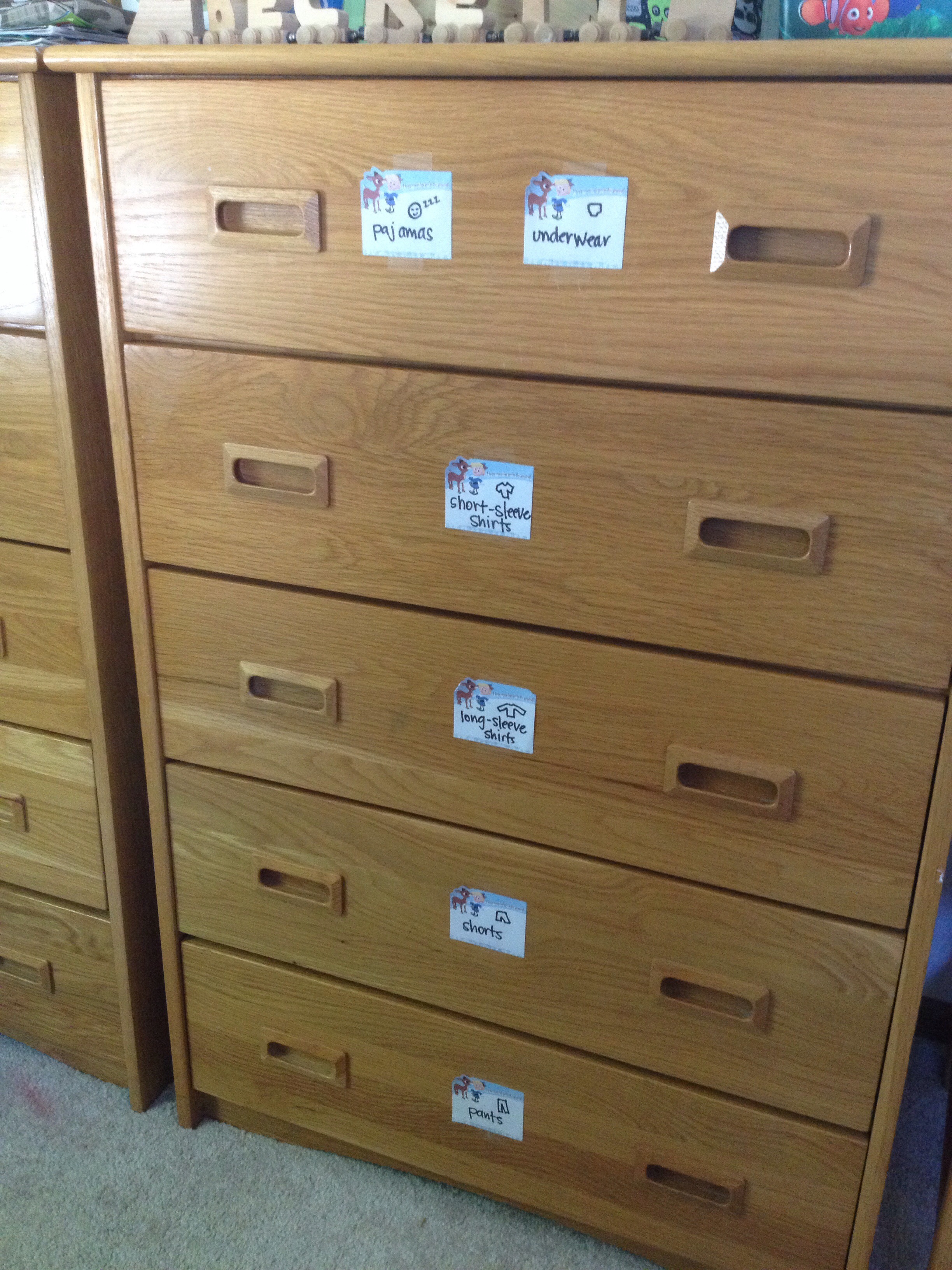 Label things that change often. Our kids have one cabinet with 5 drawers each for their clothes. Each season the items inside shift slightly to accommodate for the new clothes needed for changing temperatures. I label the front of each drawer with the name and a small picture of the items to make it easy for everyone in the house (even the 4-year-old) to find what they need to get dressed each morning. Easy! Prep kids in advance for the changes and, if possible, get them involved in the process. Kids can help label, learn to read labels and help put clothes away by looking at the label/picture.