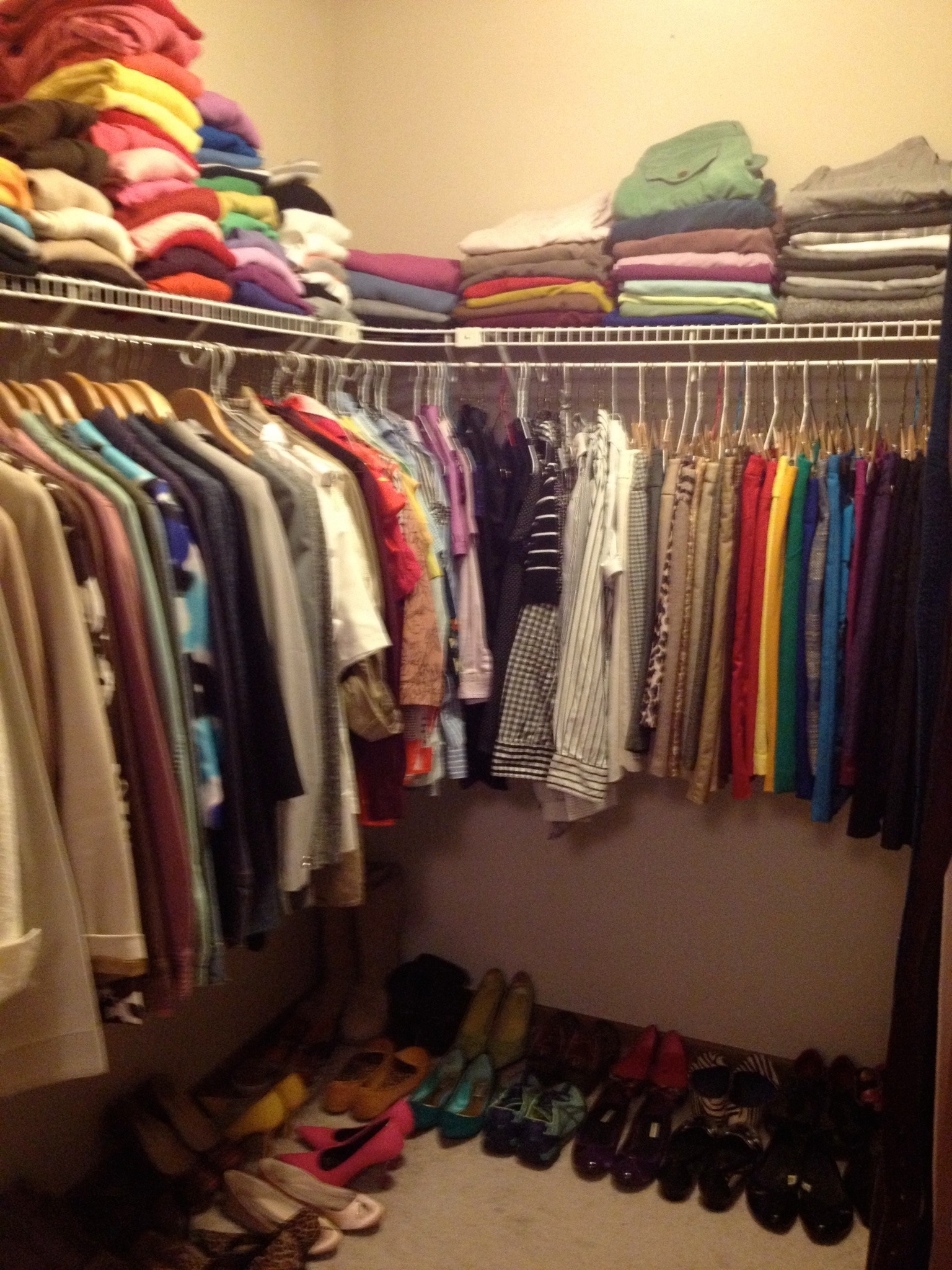 20% of your clothes are what you wear 80% of the time. I bet your closet is full of clothes. I’d feel pretty safe betting it’s bursting with clothes. But how many of those items do you really love? Why do you still own them? Are you waiting to lose 5 lbs? lose 30 lbs? Does it hold a special memory? If you only really wear about 1 of every 5 items–why don’t you clean up your closet and get rid of the other 4 things? I promise, it will feel like a weight has been lifted off of your shoulders to only have clothes that you love, that fit you well and that look great in your closet. If it doesn’t’ fit and you don’t love it, then you don’t need it. Try this! Go through your closet and get rid of 20% of your clothes. Donate them to a group that will make good use of them. Do it, you’ll feel better and you’re helping others. If doing the whole closet at once seems like too much, just spend 15 minutes a day or pick one category (like pants) to start with.