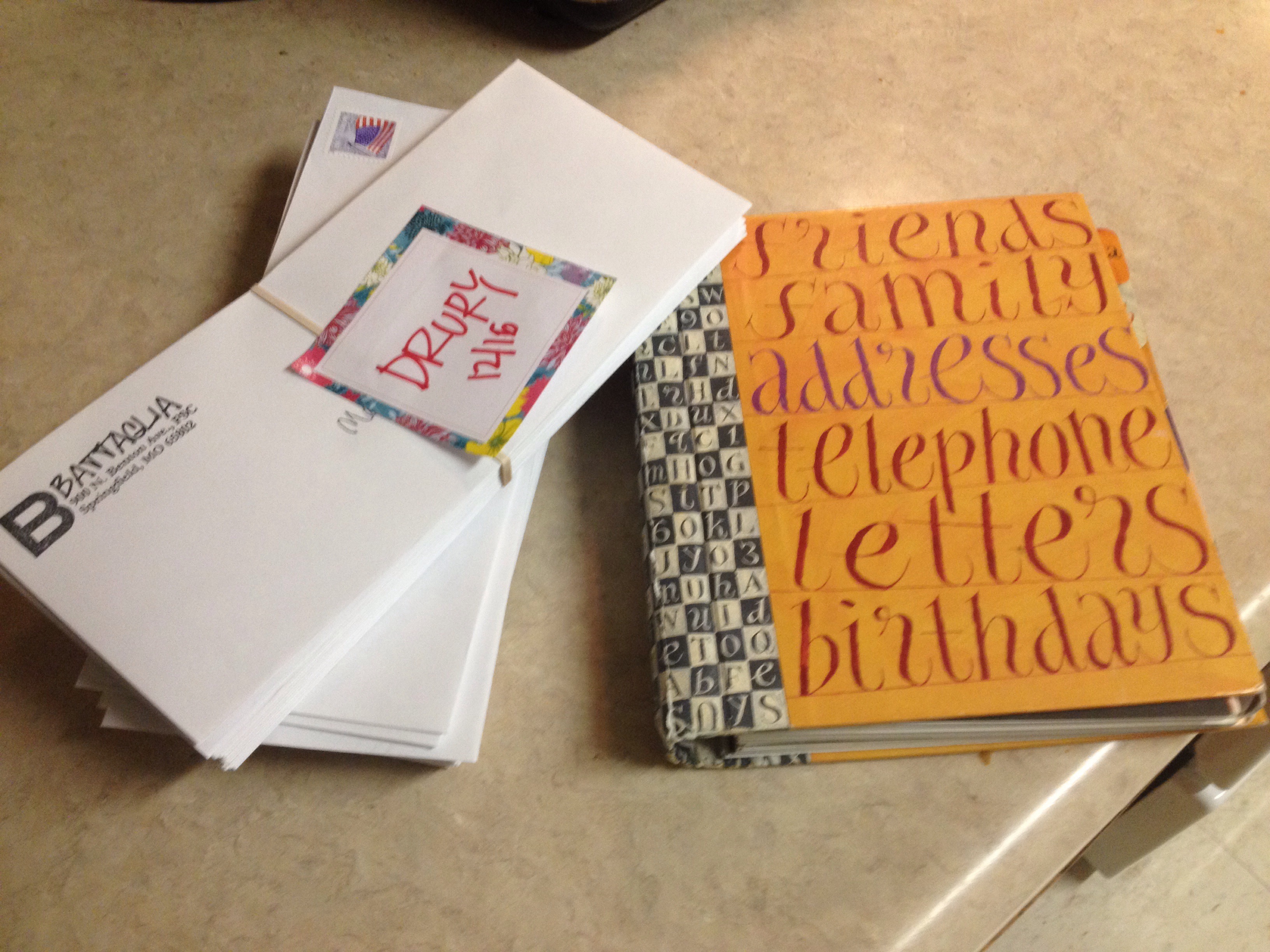 Create an electronic list for your holiday cards. Tired of deciphering your hand-written list or is it too much trouble to go through your address book each year? A simple word or excel document will make your list more organized. Organize by family last names and include relevant information like first names, addresses, anniversaries, birthdays and children’s names. We also have columns for who to include in our monthly cards and our Christmas cards, helping us update the list quickly. I store the printed excel document in the front cover of my address book.
