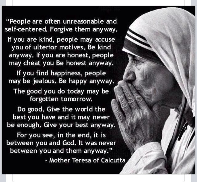 Others will let you down; love them anyway. I love to be alone because people take work. And I’m tired. So tired. Too many people have let me down. Thankfully, sometimes I see a glimpse that reminds me of the good in the world and I choose to set my mind on these moments. There’s this guy I know that unbelievably takes the road less traveled. I think, “Punch them in the face!” and he forgives them. I think, “Tell them how wrong they were!” and he gives them a grace-filled moment. I’ve seen others let him down in moments of need, to his face, in his weakest times. And he still loves them and he forgives them. He reminds me that anything human is inherently flawed; and that helps me to understand the good that still exists in this world.