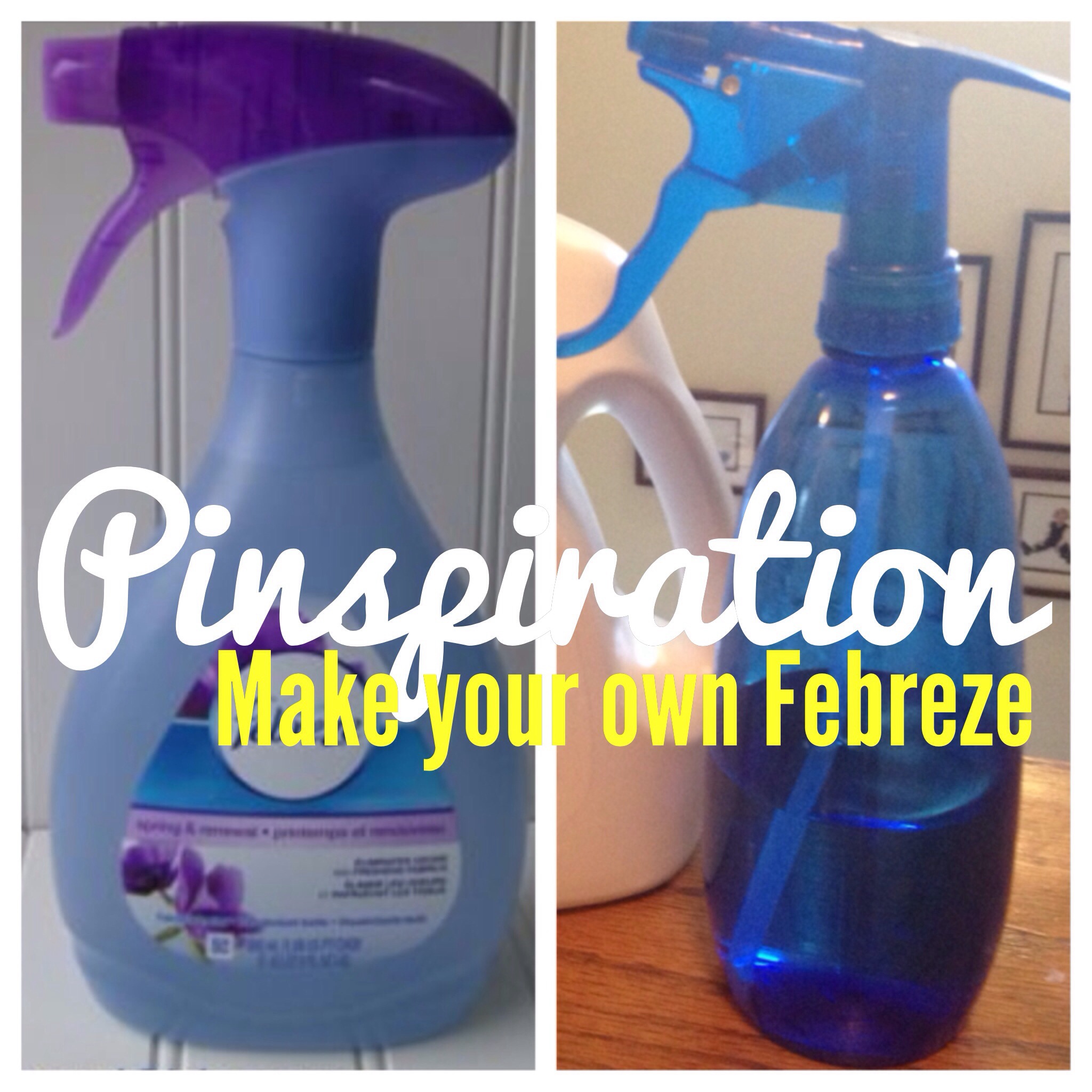 Pinspiration: Make Your Own Febreze. This easy, useful project can be completed in 15 minutes. And the recipe seems to hold up to the original very well. Recently, my husband even commented about how good our room smelled after I’d sprayed my mix – awesome!