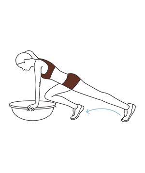Mountain Climber Equipment: You can use a BOSU, platform side up, with this exercise or you can place your hands on the floor. Keep the BOSU stable and place your hands on the side of the equipment with your head over the center of the device.