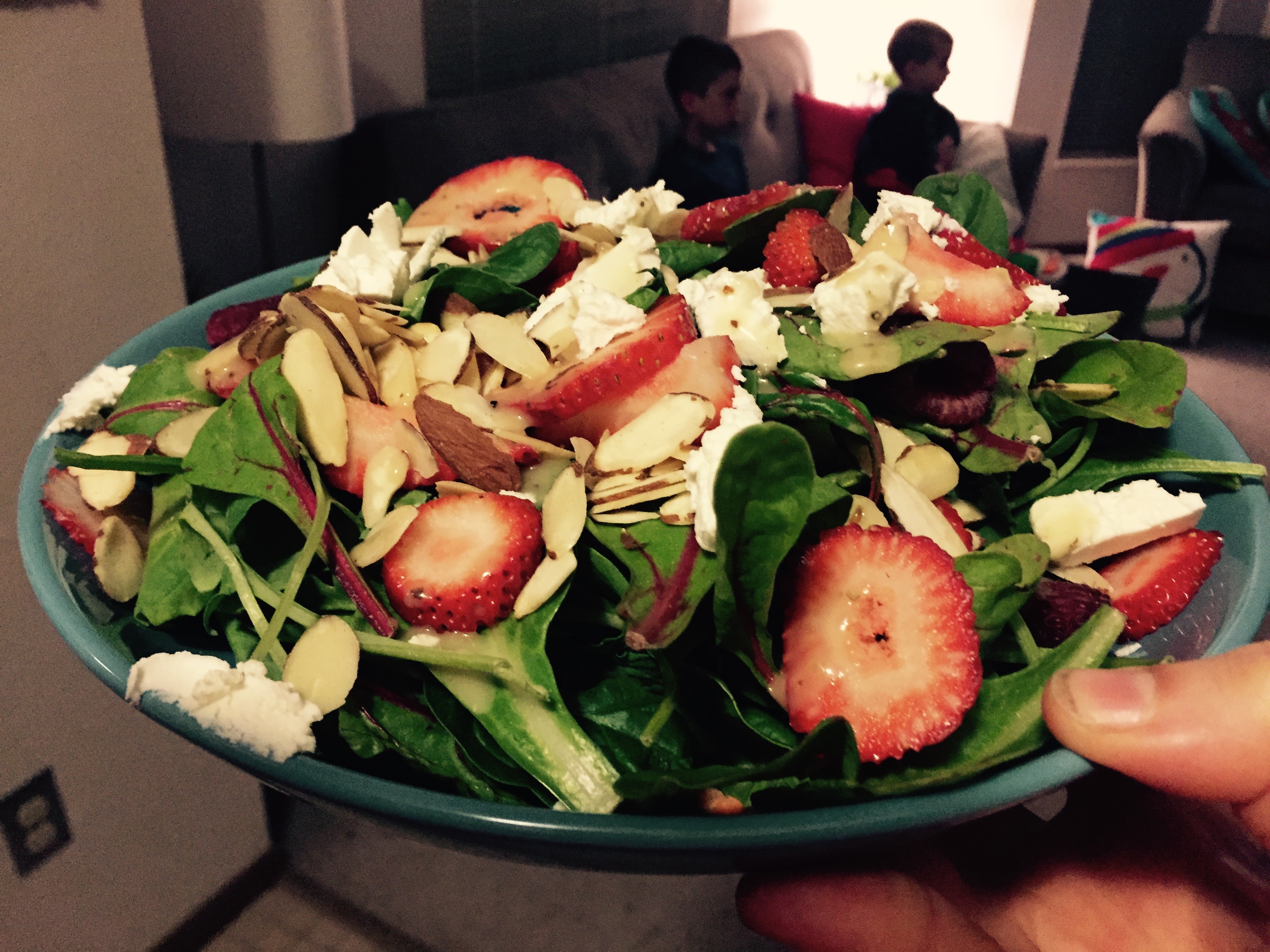 We eat salad weekly. This means we need to switch up our options regularly. To always have salad on hand, buy the lettuce and veggies for only what you need that week. Keep cheese in the freezer until you’re going to use it. For the protein – here is the genius tip I got from a friend a few years ago – buy your protein, marinade it in a ziploc bag and freeze it with the marinade. When you’re ready to use it, just thaw and cook! I also slow grill big batches of chicken on the weekends and then slice it after it’s cooled, freeze it in single serving containers and we can take these salads in our lunches easily. Here is my favorite “recipe” for the perfect salad: